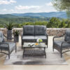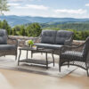 Add a touch of French country elegance to your patio or covered porch with this charming outdoor sofa set. The set includes a loveseat, a coffee table and two club chairs that creates a cohesive look and comfortably accommodates up to 4 people. Constructed from powder-coated aluminum frame wrapped with resin wicker, each piece exudes a blend of durability and style. The coffee table can hold snacks and drinks, its open shelf is ideal for storing extra towels and books. Topped with button-tufted back and seat cushions, provides ample support for relaxation and leisure. Transform your outdoor space into a cozy retreat with this versatile and stylish sofa set.