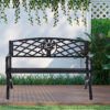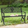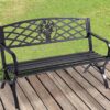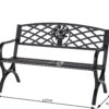 – Our outdoor bench is made of sturdy cast iron. The surface comes with a layer of protective waterproof coating. Cast iron construction makes this patio bench heavy-duty-oriented and durable enough for long-term usage.