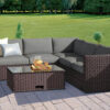 This 4-piece outdoor seating group gives you a spot to hang out with family and friends on your patio or deck. It includes two one-armed sofas and a corner seat that form an L-shaped sectional when combined. A coffee table with a tempered glass top is also included to serve as a surface for snacks and drinks. Each piece has a powder-coated steel frame wrapped in all-weather resin wicker rattan, which is highly durable. Multiple foam-padded linen cushions provide just the right amount of support as you relax. Cushion covers can be easily zipped up and quickly cleaned to give them a fresh look.
