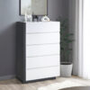 Simplicity combined with practicality is an outstanding expression of modern furniture. This Kalmia range features two cool colors tones of grey and white that highlighting its personality and elevate your home style. Practical yet stylish, this Kalmia 5-Drawer Tallboy with ample space drawers, store your clothes, blankets and linens in an organized way. Adding this piece to your room not only offers storage solution but also meets your modern taste.