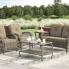 Bring comfort and style to your outdoor space with this wicker sofa set. The powder-coated metal frame combines with premium PE wicker to create a traditional and coastal style that’s perfect for entertaining guests. The removable and washable polyester cushion covers in brown are amply padded for comfort, while the button-tufted seat backs add a touch of elegance. The water-resistant set includes a loveseat, two club chairs, and a coffee table with a glass top for drinks and snacks.