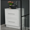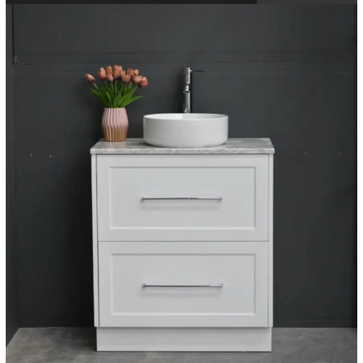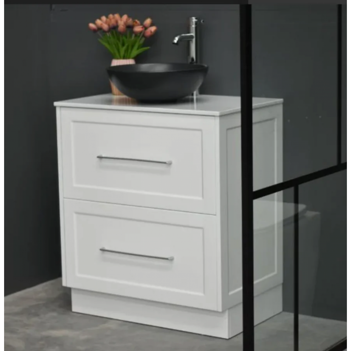 Jess Quartz StoneVanity Set. White Freestanding vanity unit with a  Quartz Stone top and soft close drawer. Complete with Ceramic Counter Top Basin.