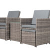 The Vicenza rattan chair set adds more natural color to your yard with grey cushion and mixed grey rattan. This outdoor furniture set is crafted of weather-resistant hand-woven rattan and sturdy aluminium frame, which is durable enough to withstand rain and wind for long time use. Its thick sponge padded cushions and ergonomic back double the comfort for you to totally relax yourself. This patio chair set will let you enjoy fun with family and friends while also taking in the view and fresh air. Good choice for patio, porch, backyard, balcony, poolside, garden and other suitable space in your home.